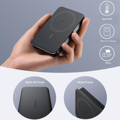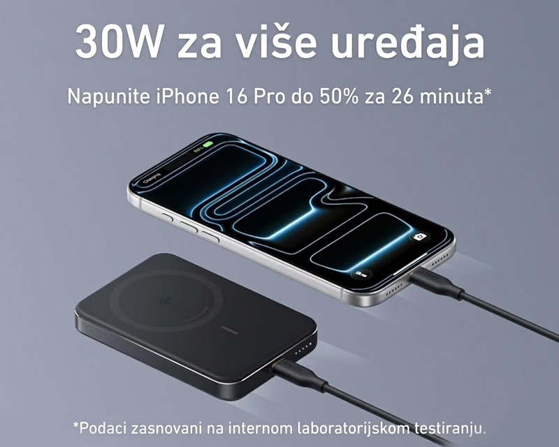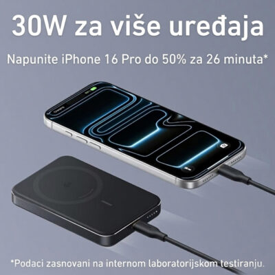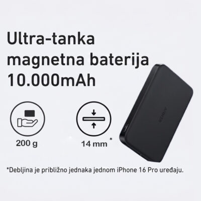 | Dodatne funkcije | LED indikator, Ugrađen snažni magnet, Bežično punjenje brzine 15W, Podrška za MagSafe, Qi 2.0 Wireless standard bežičnog punjenja, Usklađeno sa avionskim standardima, Vreme punjenja oko 2.5h |