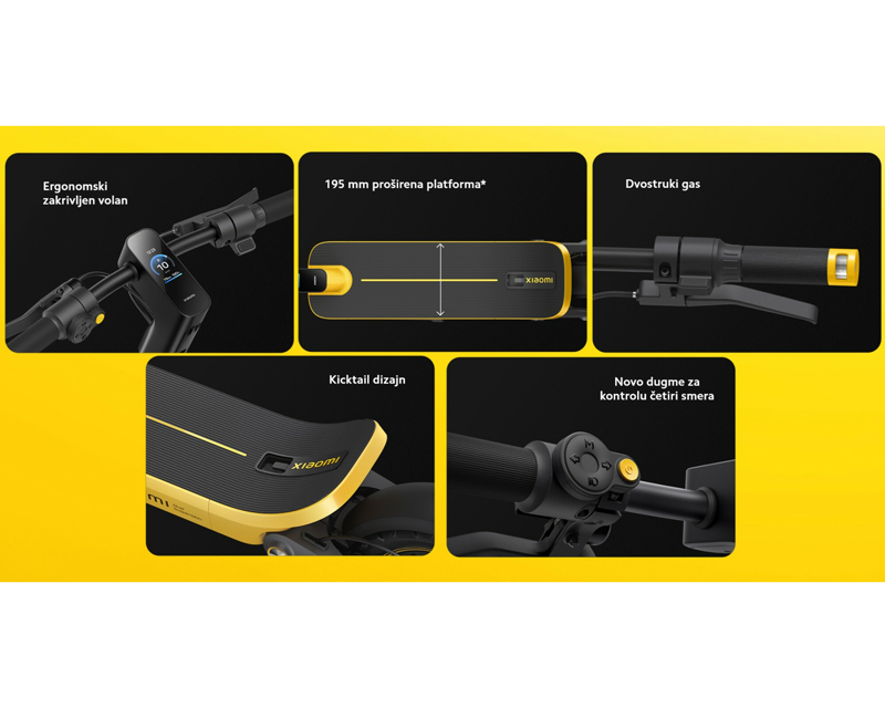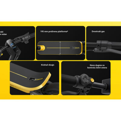 | NAPOMENA | LED displej na volanu, Mi Home/Xiaomi Home aplikacija, Prednje i zadnje disk kočnice, Šasija konstruisana za off-road vožnju, TCS sistem protiv proklizavanja, Ugao zadnjeg dela od 30° radi ergonomske udobnosti, Visina vozača: 120-200cm |
